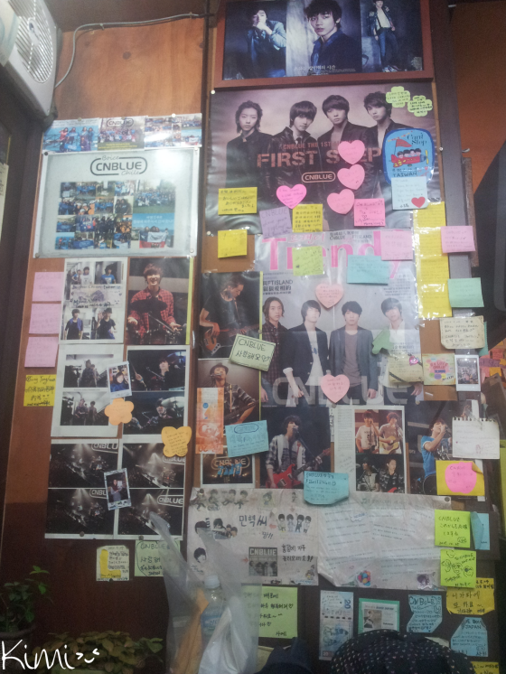 AprĂšs le concert du deuxiĂšme jour, j’ai retrouvĂ© June accompagnĂ©e de ses amies et nous sommes allĂ©es manger au restaurant du pĂšre de Minhyuk (histoire de rester dans le thĂšme CNBLUE hahahaha). Il gĂšre un petit restaurant sympa du nom de 황가넀 ꌌ임ꔰ (hwang-gane kkomjang-gun et dĂ©solĂ©e, je ne comprend pas ce que ça veut dire) oĂč on peut se faire un bon BBQ et aussi manger divers plats corĂ©ens comme du bibimbap, ainsi que du riz, de l’omelette… Il s’agit d’une chaĂźne et il y en a pas mal dans SĂ©oul et ailleurs en CorĂ©e. Celui-ci fait honneur Ă  Minhyuk et Ă  CNBLUE avec des tonnes de photos d’affichĂ©es. Il est aussi possible d’Ă©crire un petit message et de le coller sur les murs, chose que les milliers de fans qui sont dĂ©jĂ  venus manger ici n’ont pas manquĂ© de faire ! Il se trouve Ă  Yeongdeungpo.