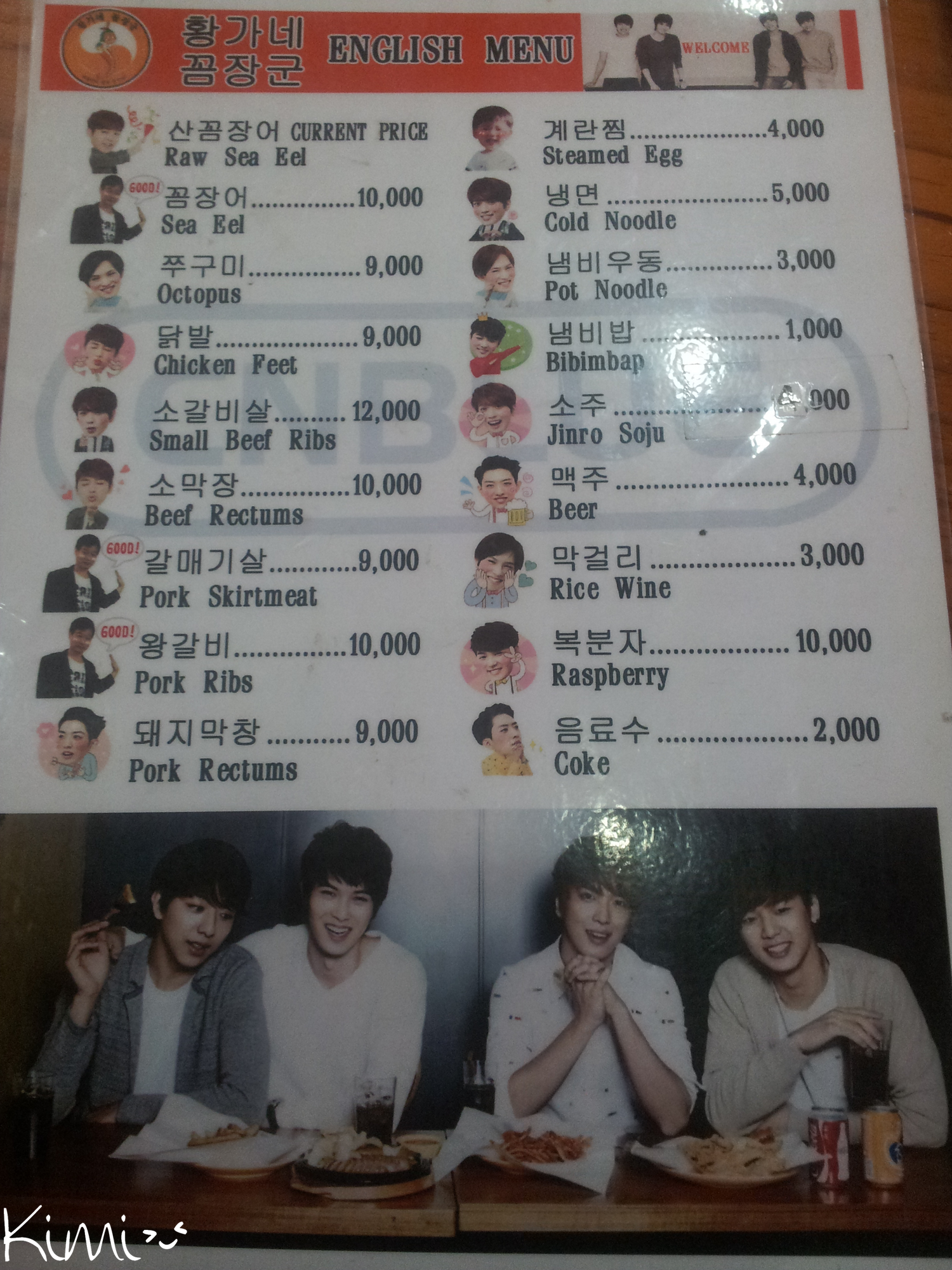 AprĂšs le concert du deuxiĂšme jour, j’ai retrouvĂ© June accompagnĂ©e de ses amies et nous sommes allĂ©es manger au restaurant du pĂšre de Minhyuk (histoire de rester dans le thĂšme CNBLUE hahahaha). Il gĂšre un petit restaurant sympa du nom de 황가넀 ꌌ임ꔰ (hwang-gane kkomjang-gun et dĂ©solĂ©e, je ne comprend pas ce que ça veut dire) oĂč on peut se faire un bon BBQ et aussi manger divers plats corĂ©ens comme du bibimbap, ainsi que du riz, de l’omelette… Il s’agit d’une chaĂźne et il y en a pas mal dans SĂ©oul et ailleurs en CorĂ©e. Celui-ci fait honneur Ă  Minhyuk et Ă  CNBLUE avec des tonnes de photos d’affichĂ©es. Il est aussi possible d’Ă©crire un petit message et de le coller sur les murs, chose que les milliers de fans qui sont dĂ©jĂ  venus manger ici n’ont pas manquĂ© de faire ! Il se trouve Ă  Yeongdeungpo.