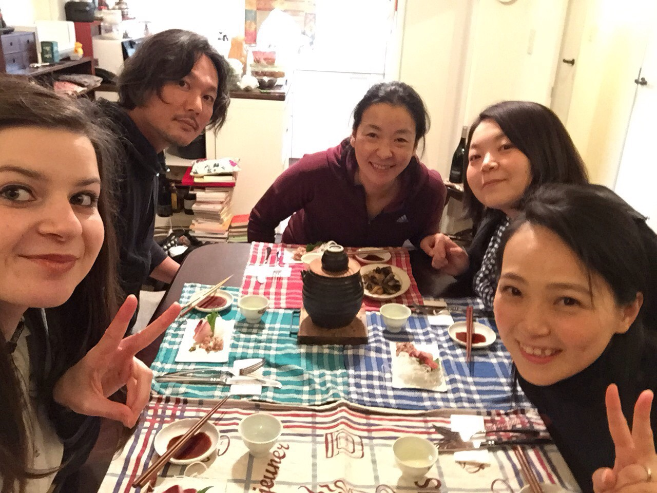 Sashimi, karaage, oden (un pot-au-feu japonais composé de gâteaux de poisson et de légumes) pour le côté japonais et… bœuf bourguignon avec du couscous pour le côté français, cuisiné par le mari de Tomoko (il est très doué, c’était un régal *-*), sans oublier du bon pain, du fromage, du saké et du vin rouge !