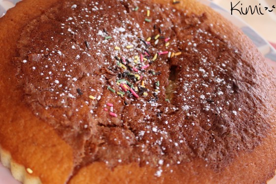 焼いたらケーキに冷めさせてくれて、デコレ材をふって出来上がりです。